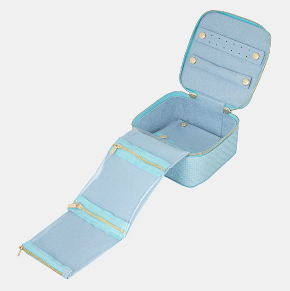 The interior also includes a dedicated ring holder and an earring holder, ensuring each piece stays secure and tangle-free. Whether you're on-the-go or simply looking for a way to keep your jewellery stored at home, this sophisticated jewellery storage solution incorporates sky blue, mint, and delicate lilac tones.