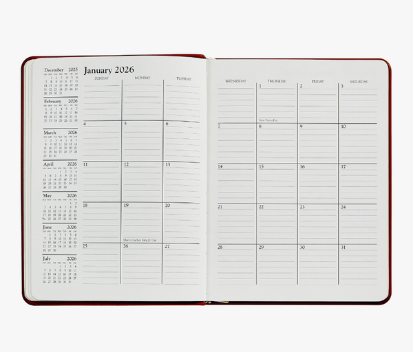The standard by which all desk diaries are measured today. Our week-at-a-view desk diary has a vertical format designed with such economy that our trim size offers more writing space than most larger, more cumbersome diaries. This is a pure appointment book designed to organize your day, week, month, and year.