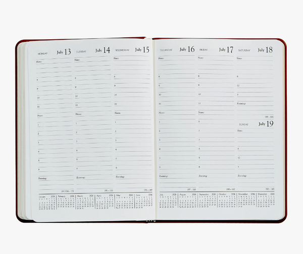 The standard by which all desk diaries are measured today. Our week-at-a-view desk diary has a vertical format designed with such economy that our trim size offers more writing space than most larger, more cumbersome diaries. This is a pure appointment book designed to organize your day, week, month, and year.