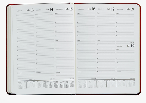 The standard by which all desk diaries are measured today. Our week-at-a-view desk diary has a vertical format designed with such economy that our trim size offers more writing space than most larger, more cumbersome diaries. This is a pure appointment book designed to organize your day, week, month, and year.