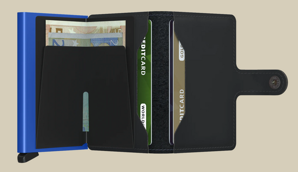 Small in size and surprisingly large in storage capacity, the Miniwallet combines the best of both worlds. The exterior holds banknotes, receipt and cards, while the aluminium Cardprotector allows you to slide out cards with one simple motion and protects them from bending, breaking and unwanted wireless communication.