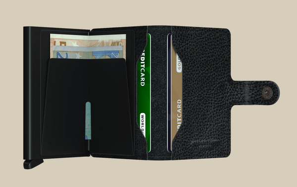 Small in size and surprisingly large in storage capacity, the Miniwallet combines the best of both worlds. The exterior holds banknotes, receipt and cards, while the aluminium Cardprotector allows you to slide out cards with one simple motion and protects them from bending, breaking and unwanted wireless communication.